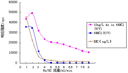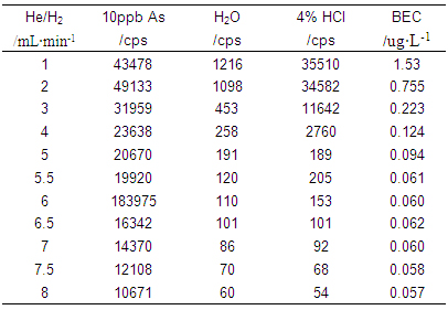 ÒÇÆ÷Ê×ÏÈÔÚ±ê׼ģʽϾÙÐвÎÊýÓÅ»¯£¨Ê¹ÓÃ10¦Ìg¡¤L-1µÄLi¡¢Co¡¢In¡¢U¡¢Ceµ÷гҺ¶ÔÒÇÆ÷ÊÂÇé²ÎÊý¾ÙÐе÷Àí£¬Ê¹ÒÇÆ÷ѸËٶȸߣ¬Í¬Ê±Ñõ»¯Îï¼°Ë«µçºÉ²úÂÊСÓÚ3%£©£»ÔÙ¿ªÆôHe/H2Åöײ·´Ó¦Æø£¬Öð²½Ôö´óHe/H2Á÷Á¿£¬²âÊÔ³¬´¿Ë®¡¢4%HCl¼°10¦Ìg¡¤L-1 As£¨4%HCl½éÖÊ£©ÔÚ75amu´¦µÄÏìÓ¦Ðźţ¬ÅÌËãÆäÅä¾°µÈЧŨ¶È£¨ÏêϸÊý¾Ý¼û±í1¼°Í¼1£©£»²¢Ê¹ÓÃAs±êÒº½øÒ»²½ÓÅ»¯He/H2Á÷Á¿£¬»ñµÃÒÇÆ÷ÊÂÇé²ÎÊýÈç±í2Ëùʾ¡£