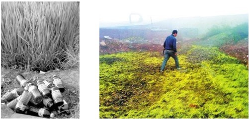 ÔÚºÓÄÏÊ¡ÒåÂíÊÐÇø4¹«Àï´¦µÄ¸õÔü³¡£¬Í¼ÖлÆÉ«ÎïÖÊÊ®·ÖÐÑÄ¿£¬Ëü¼´ÊǸõÔüÓöË®ºó±¬·¢µÄ¾ç¶¾ÎïÖÊ¡°Áù¼Û¸õ¡±¡£Õâ´¦ÊýÊ®Íò¶ÖµÄ¸õÔüÒÑ·â´æ26Äê ¡£