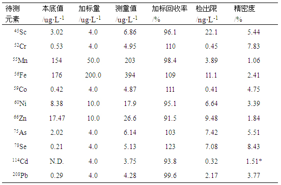 ÔÚÒÇÆ÷ÓÅ»¯ÊÂÇé²ÎÊýÌõ¼þÏ£¬¶ÔÑùÆ·ÈÜÒº¼°¼Ó±êÑùÒº¾ÙÐвâÊÔ£¬ÅÌËãÆä¼Ó±ê½ÓÄÉÂÊ£»¶ÔÑùÆ·¿ÕȱÈÜҺƽÐвⶨ7´Î£¬ÒÔÈý±¶¿ÕȱÐźűê×¼Îó²î/ѸËٶȶÔÓ¦µÄŨ¶ÈΪ¼ì³öÏÞ£»Í¬Ê±¶ÔÑùÆ·ÈÜҺƽÐвⶨ11´Î£¨¾àÀë2min£©£¬ÅÌËãÆäÏà¶Ô±ê×¼Îó²î£¬¿¼²ìϸÃܶȣ¬Êý¾Ý¼û±í4¡£¸÷ÔªËØ¼ì³öÏÞÔÚ0.41-22.07ng/LÖ®¼ä£¬¼Ó±ê½ÓÄÉÂÊÔÚ93.82%-123.10%Ö®¼ä£¬Ï¸ÃܶÈÔÚ1.06%-8.43%Ö®¼ä¡£